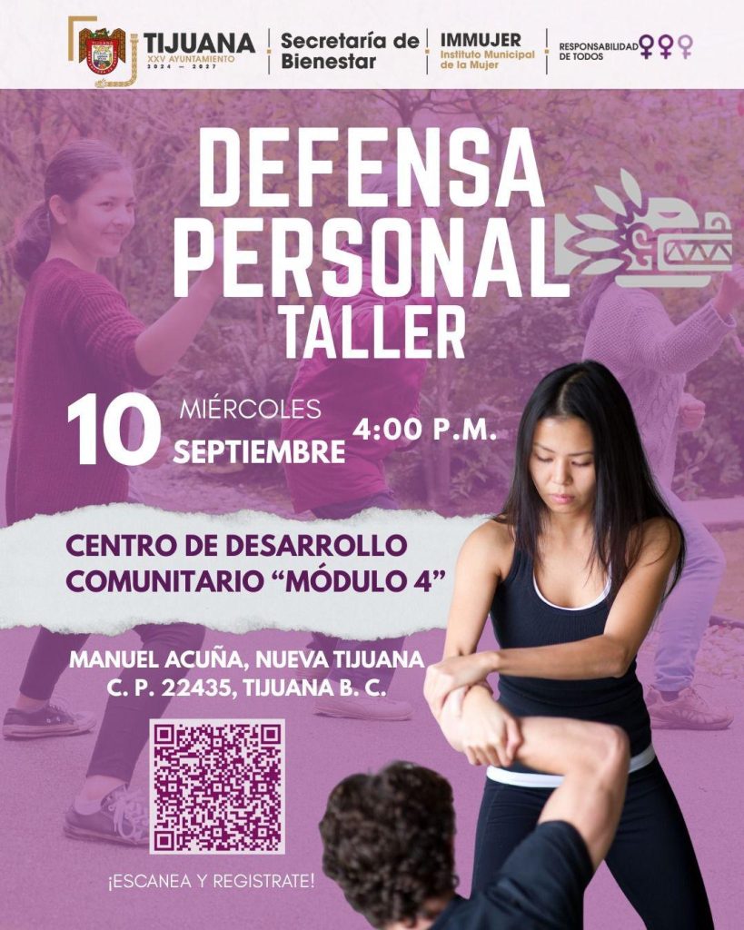 Con el objetivo de reforzar la seguridad y el autocuidado de las tijuanenses, el Ayuntamiento de Tijuana anunció la realización del Cuarto Taller de Defensa Personal para Mujeres, organizado por el Instituto Municipal de la Mujer (IMMUJER) en coordinación con la Dirección de Prevención del Delito de la Secretaría de Seguridad y Protección Ciudadana Municipal (SSPCM).