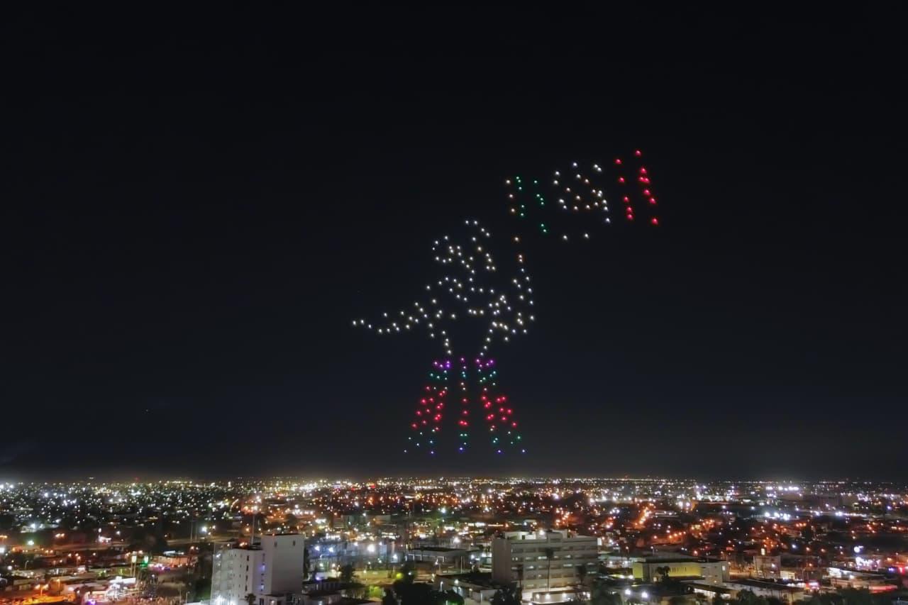 Posteriormente, un espectáculo de drones iluminó el cielo mostrando figuras como una campana, una mujer ondeando una bandera y la península de Baja California, todas alusivas a la independencia del país.