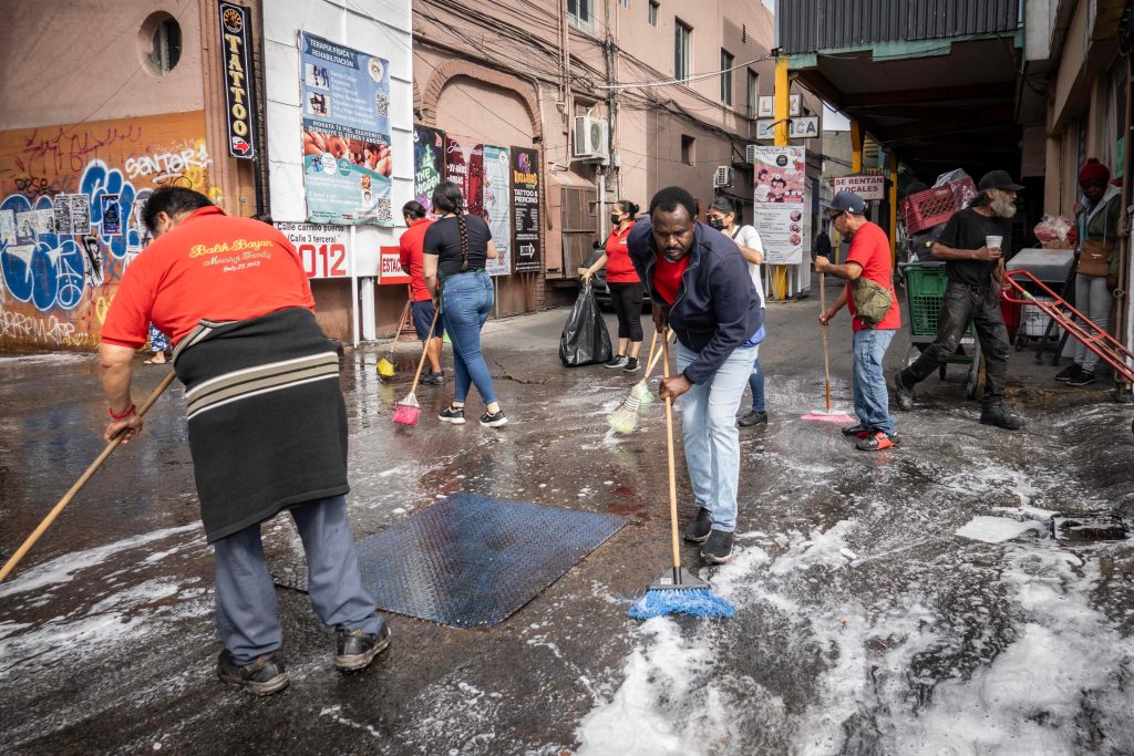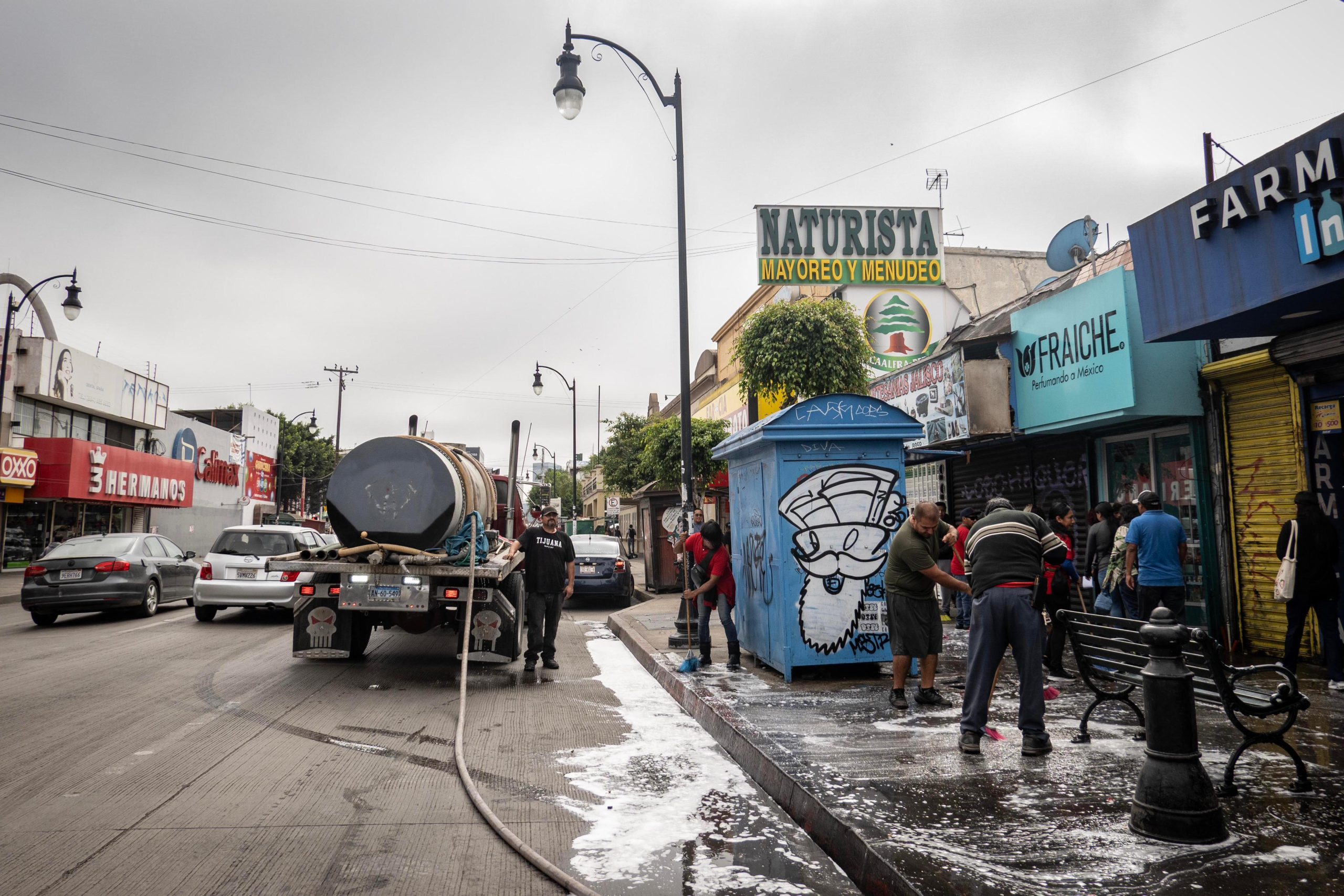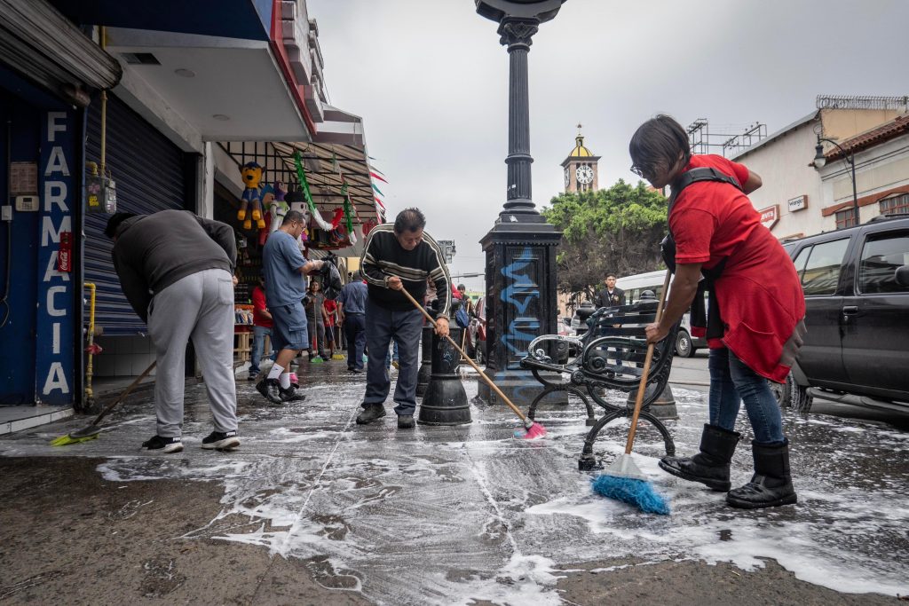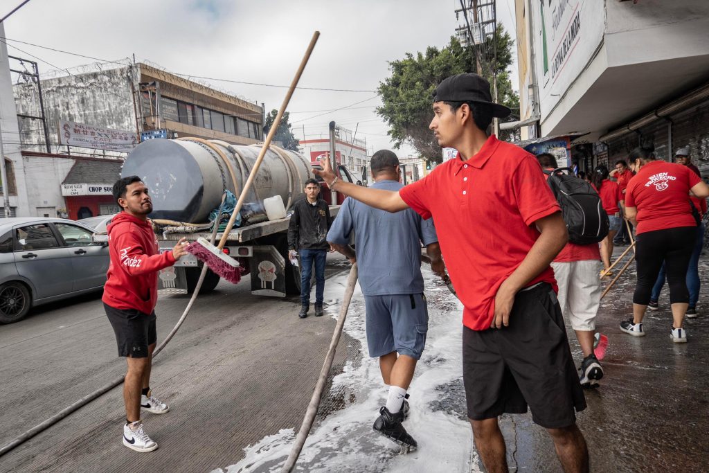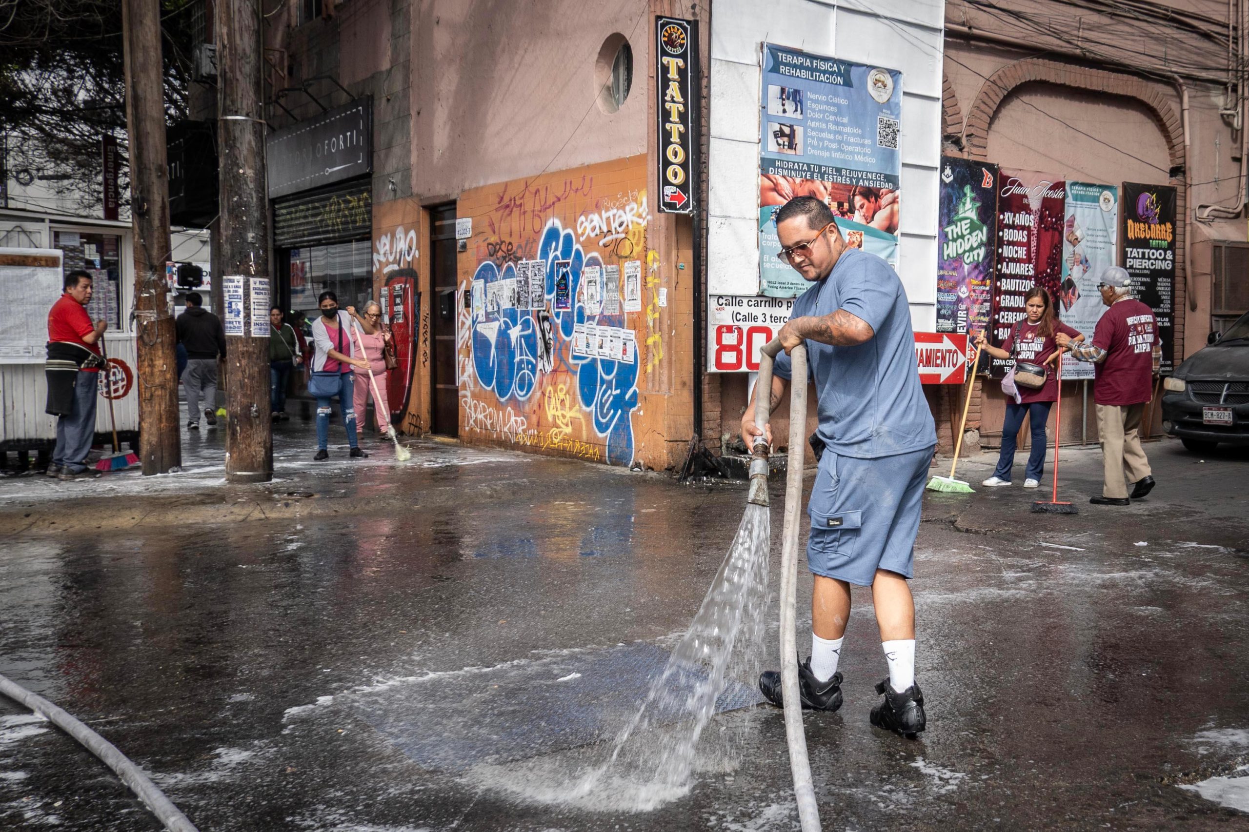 Las labores incluyeron el lavado de banquetas con agua y jabón, el tallado con escobas y el enjuague de vialidades. El operativo se llevó a cabo sobre la calle Segunda, en el tramo comprendido entre Constitución y Niños Héroes, con apoyo del Ayuntamiento de Tijuana, que facilitó una pipa de agua para los trabajos.