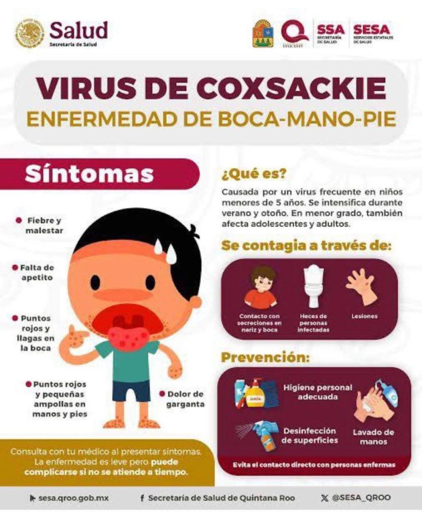 La enfermedad mano-pie-boca, provocada con frecuencia por enterovirus como coxsackie A16, se transmite por gotitas respiratorias, contacto con lesiones o superficies contaminadas. Suele cursar con fiebre, dolor de garganta, llagas en boca y erupción en manos y pies. Aunque generalmente es leve, su alta contagiosidad facilita brotes en preescolar y primaria. Autoridades sanitarias recomiendan mantener a las y los menores en casa si presentan fiebre, úlceras orales o lesiones cutáneas activas, acudir a valoración médica y extremar higiene de manos.
