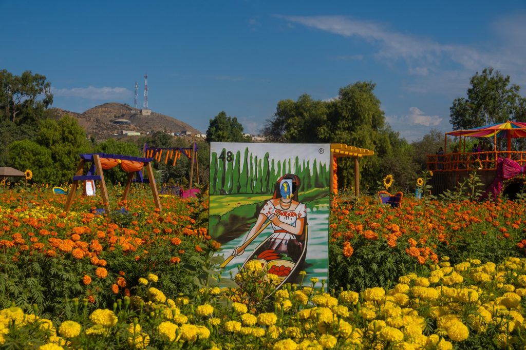 El trayecto comienza entre senderos cubiertos por flores de cempasúchil —conocidas como “flores de muerto”—, símbolo esencial del Día de Muertos por su color, aroma y su función como guía para las almas que regresan al mundo de los vivos.
