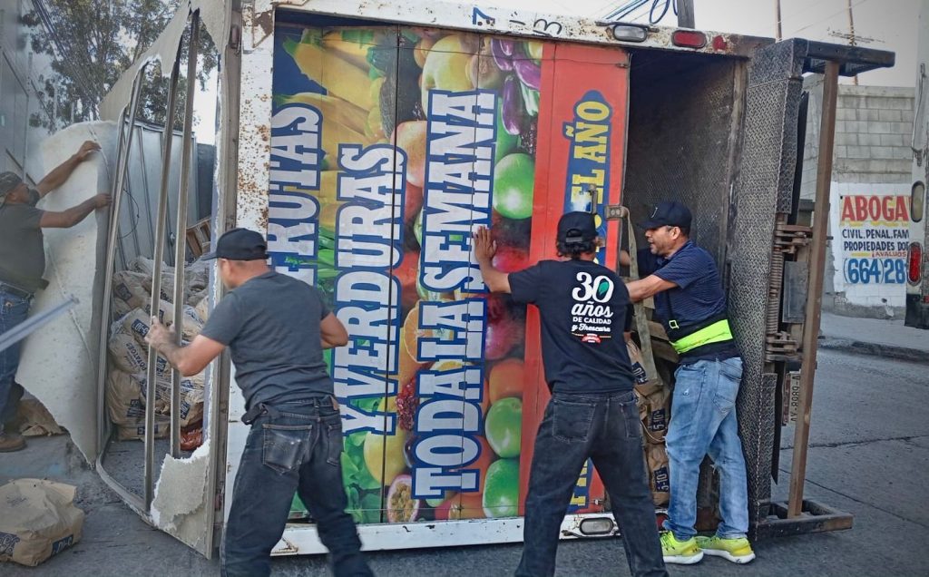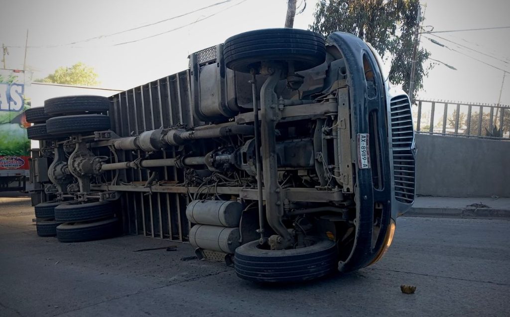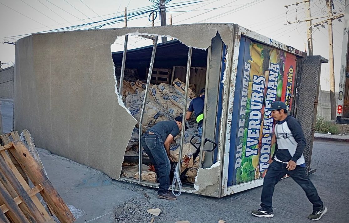 De acuerdo con los primeros reportes, el accidente se produjo cuando el conductor perdió el control de la unidad debido al exceso de peso al tomar una curva, provocando que el vehículo terminara volcado sobre la vialidad.