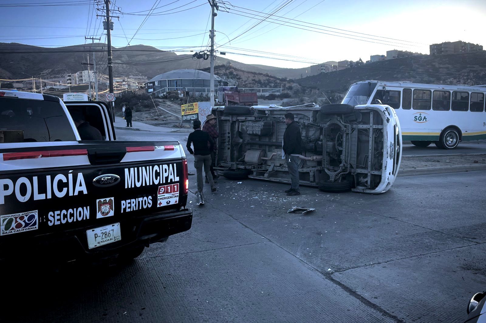 De acuerdo con el reporte preliminar, un camión de transporte de personal impactó a la unidad de transporte público con número económico 13160, lo que ocasionó que el taxi terminara volcado sobre la vialidad.