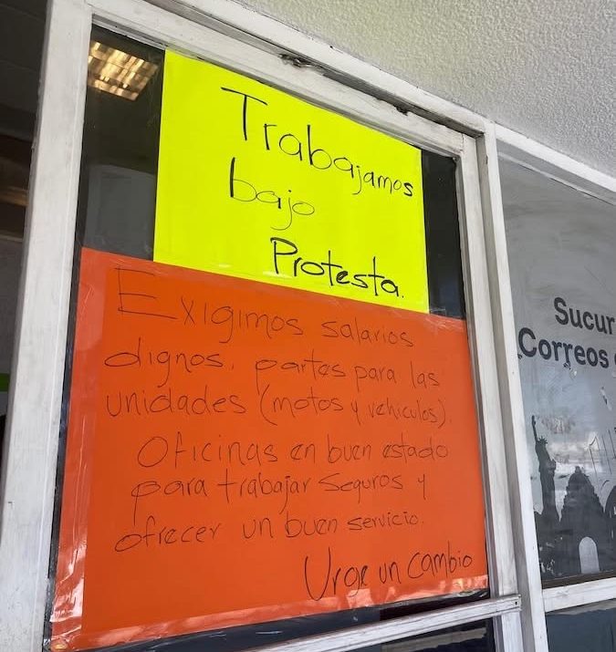 El Servicio Postal Mexicano (Sepomex) atraviesa un escenario crítico en Baja California. En la oficina de Ensenada, una cartulina en el acceso da cuenta de que el personal labora “bajo protesta”. Empleados consultados señalan que la precariedad no es nueva, pero se agudizó por la ausencia de un sistema de transporte para repartir paquetería y correspondencia.