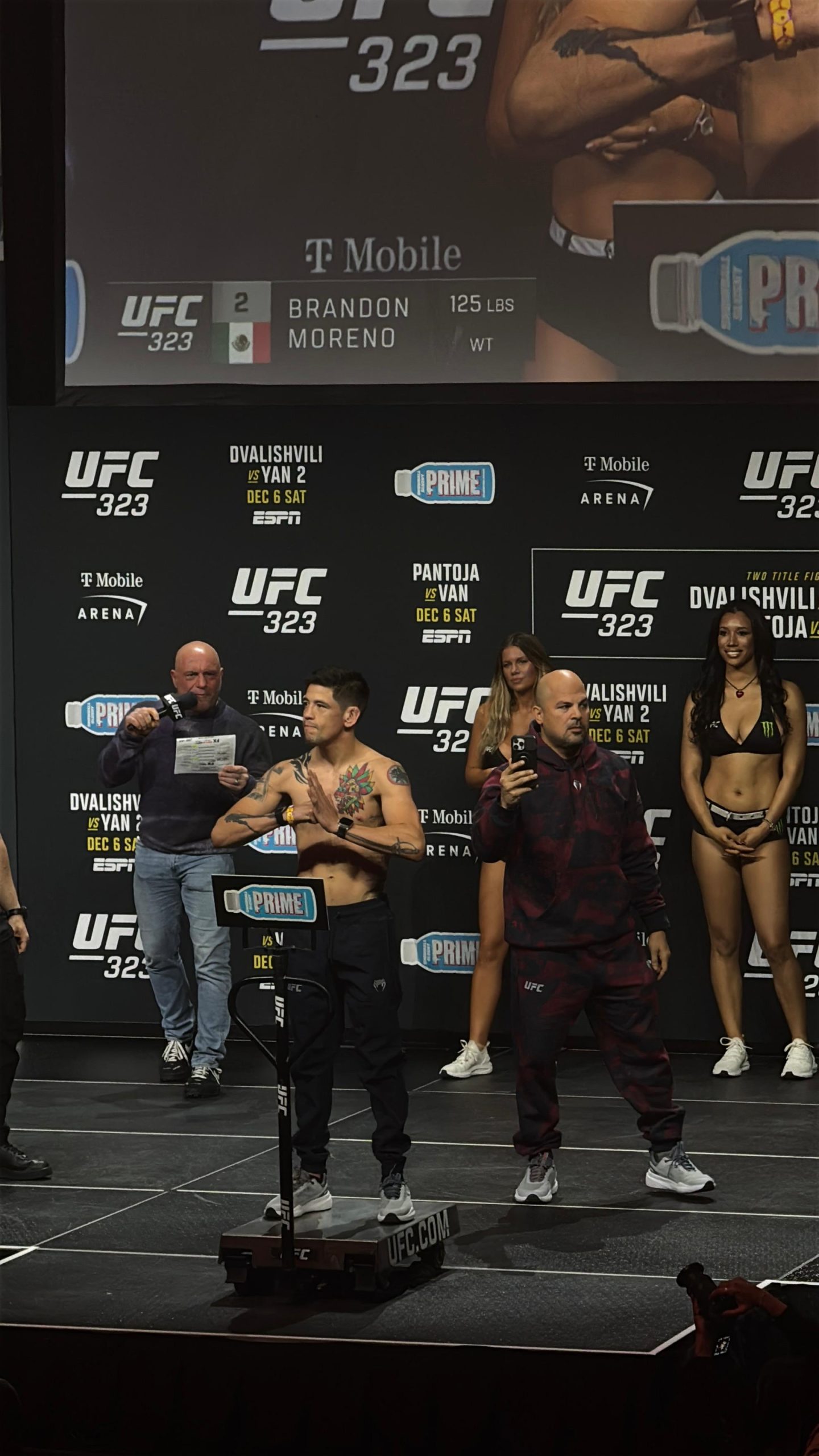 Para la audiencia mexicana, el momento más esperado llegó con Brandon Moreno, quien lució relajado, firme y enfocado al presentarse con 125 libras exactas para su combate ante Tatsuro Taira. El tijuanense fue de los más ovacionados del día, reflejando la fuerza de una comunidad que recorrió la frontera para acompañarlo, junto con todos los extranjeros que también lo apoyan. A diferencia de la noche anterior -cuando evitó entrar en polémicas sobre un posible retiro o futura pelea con Henry Cejudo-, hoy Moreno se mostró enteramente concentrado en su objetivo: regresar a la disputa por el campeonato mosca. Taira, por su parte, también cumplió con 126 libras y fue recibido con respeto por el público pese a que no contaba con mucho apoyo de sus paisanos en el recinto.