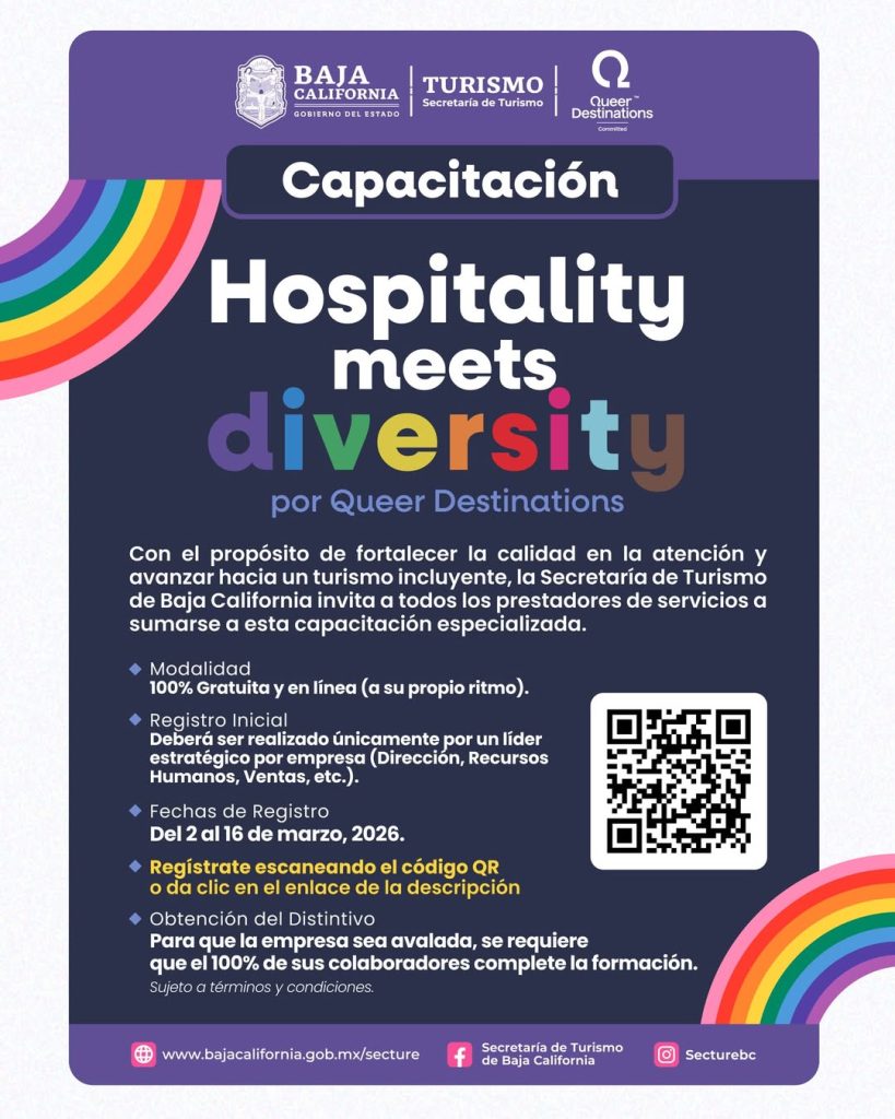 PLAYAS DE ROSARITO, B.C.– La Secretaría de Turismo de Baja California abrió el registro para la capacitación gratuita “Hospitality Meets Diversity”, dirigida a prestadoras y prestadores de servicios turísticos de la entidad, como parte de las acciones orientadas a fortalecer la inclusión y la profesionalización del sector.