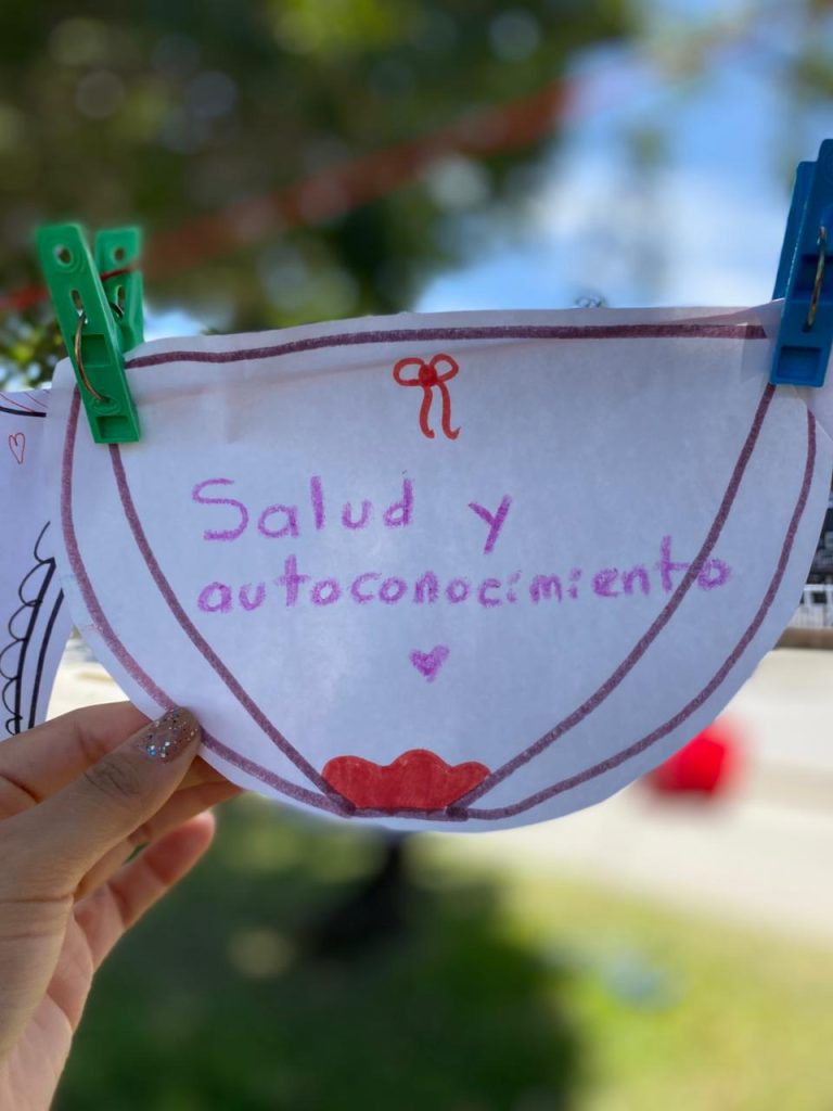 Durante la jornada, las integrantes instalaron una dinámica participativa en la que invitaron a mujeres asistentes a escribir la primera palabra o idea que les venía a la mente al escuchar el término “menstruación”. Posteriormente, los mensajes fueron colocados en un tendedero visible para compartir las distintas percepciones sobre el tema.