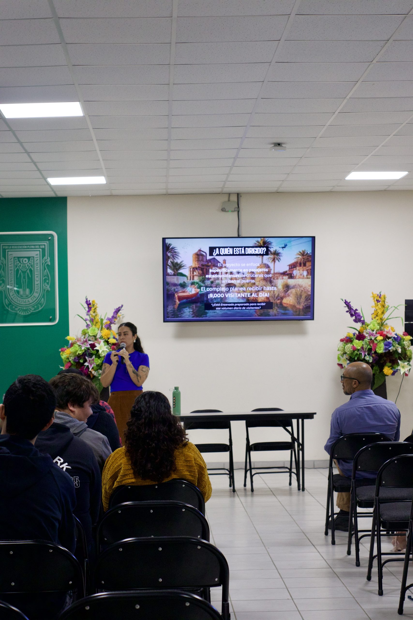 Amapola González, integrante del colectivo, expuso los posibles efectos del desarrollo turístico en la zona portuaria ante la comunidad universitaria. El evento buscó analizar la gestión del agua y el modelo de crecimiento urbano propuesto para la ciudad.