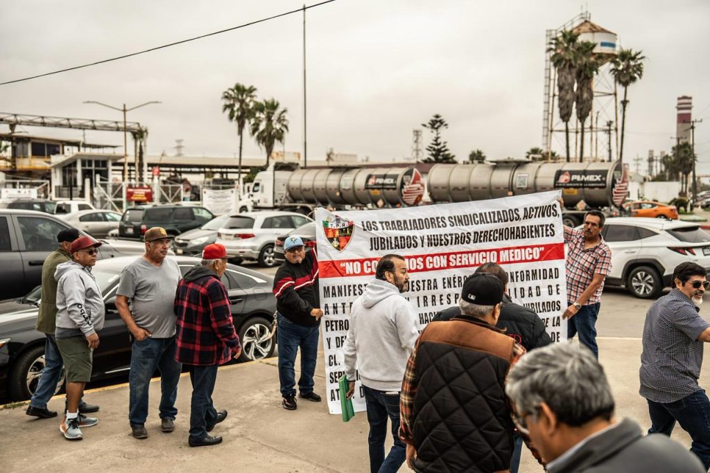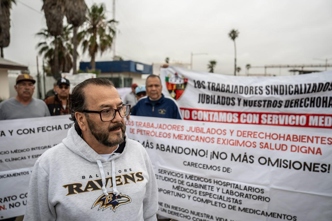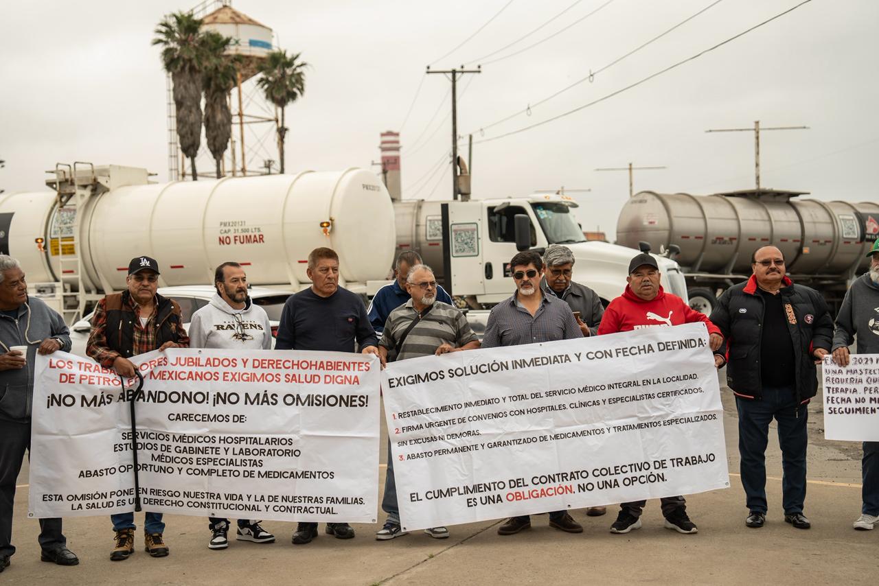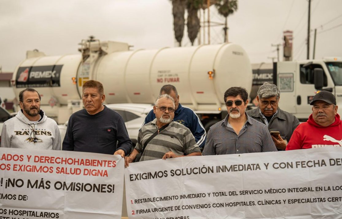 ROSARITO, B.C.– Jubilados de Petróleos Mexicanos se manifestaron de manera pacífica en instalaciones de la paraestatal en Playas de Rosarito, para exigir el cumplimiento de su contrato colectivo, particularmente en lo relacionado con la atención médica.
